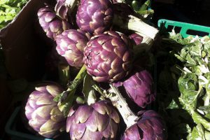 Rosalia mit dem silbernen Zahn spritzt ihre welke Ware wach. Andere tuscheln über Preise, die leider nie so hoch sind, wie die Frisur der roten Dame, die nach Auberginen sucht. Der warme Langosch lenkt Zeit zerrinnt wie das Wasser am Brunnen. (2018) | © Karin Bock |